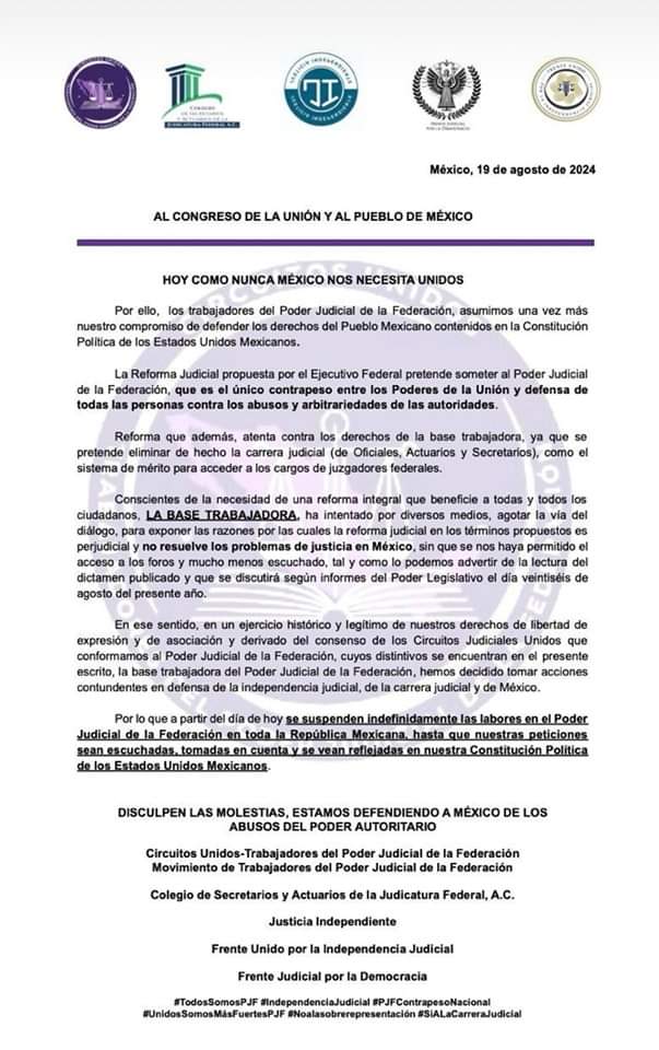Ciudad de México, 19 de agosto de 2024.- En un movimiento sin precedentes, los trabajadores del Poder Judicial de la Federación han anunciado un paro indefinido a partir de hoy, como respuesta a la Reforma Judicial propuesta por el Ejecutivo Federal. Este paro, que abarca todo el país, es un acto de protesta en defensa de la independencia judicial y de los derechos laborales de la base trabajadora.