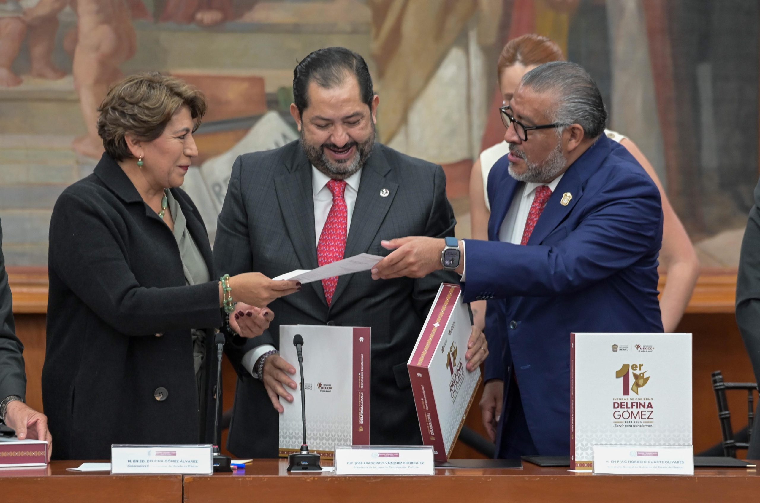 Al entregar personalmente el informe y anexos de su primer año de gestión en el Poder Ejecutivo estatal, la gobernadora Delfina Gómez Álvarez recalcó la importancia de informar acerca del estado que guarda la administración pública estatal y ratificó el compromiso y disposición de su gobierno para trabajar de manera conjunta, coordinada y armoniosa, con el Poder Legislativo por el bien de las y los mexiquenses.