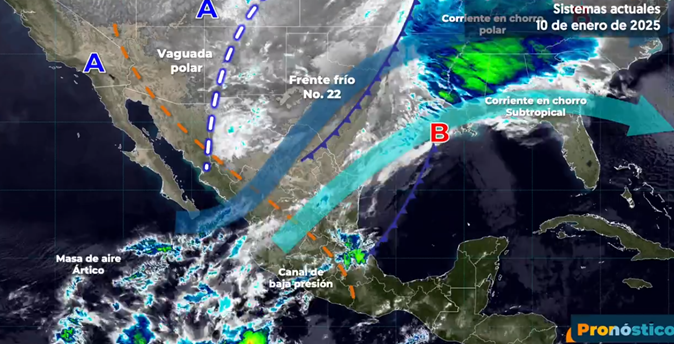 Los vientos fuertes pronosticados podrían originar la caída de árboles y anuncios publicitarios, por lo que se exhorta a la población a atender los avisos del Servicio Meteorológico Nacional (SMN), de la Comisión Nacional del Agua (Conagua) y seguir las recomendaciones de Protección Civil. Finalmente, se espera oleaje de 2 a 4 metros (m) de altura en costas de Tamaulipas y Veracruz, y de 1 a 3 m de altura en la costa occidental de la península de Baja California. Lo anteriormente mencionado se originará por una vaguada polar extendida sobre el noroeste y norte del territorio nacional, la corriente en chorro polar, el frente frío número 22 sobre el noreste y oriente del país, la masa de aire polar. Mantente informado en las páginas www.gob.mx/conagua y https://smn.conagua.gob.mx, en las cuentas de X @conagua_mx y @conagua_clima, y de Facebook www.facebook.com/conaguamx, así como en la aplicación para Lugar Fecha Ciudad de México 10 de enero de 2025 (matutino) Pronóstico meteorológico para medios dispositivos móviles ConaguaClima, donde se puede consultar el pronóstico por municipio.