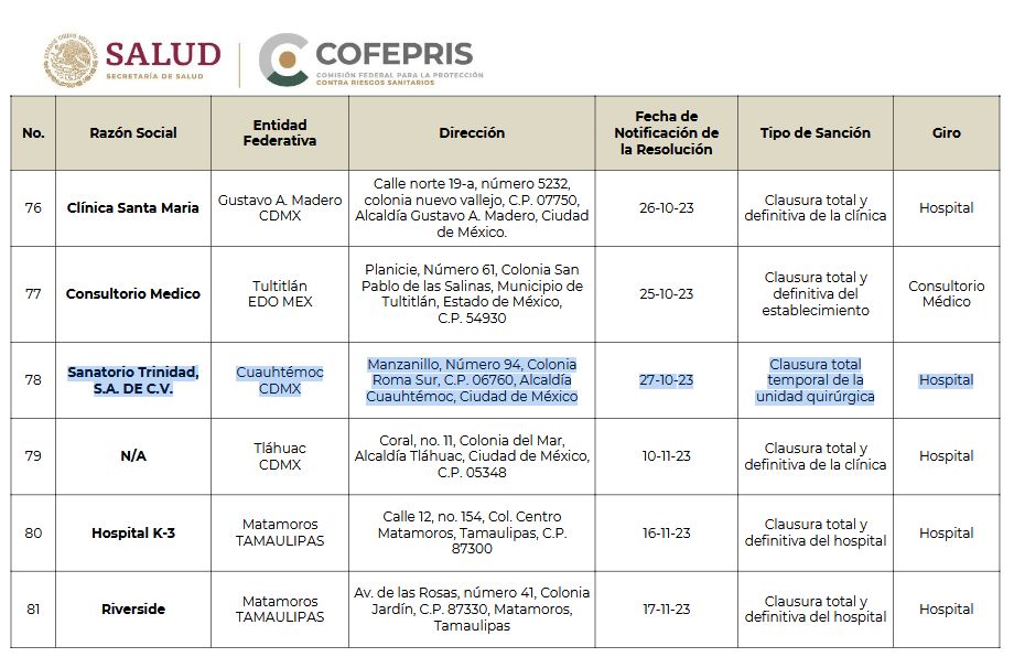 El 17 de enero, en el Comunicado de prensa 05/2024, el gobierno de México a través de Cofepris emitió un comunicado que se titula: “Cofepris detecta nuevas clínicas clandestinas: todas fueron clausuradas por alto riesgo sanitario” y entre ellas se encuentra listado el Sanatorio Trinidad, S.A. DE C.V. de la Ciudad de México, con domicilio en Manzanillo, número 94, Colonia Roma Sur, C.P. 06760, Alcaldía Cuauhtémoc, Ciudad de México con una sanción como “clausura total temporal de la unidad quirúrgica”. Tal suspensión fue ratificada el 21 de junio de 2024.