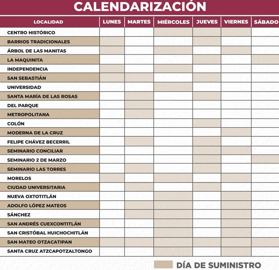 Seminario Conciliar los jueves y viernes; los viernes, Moderna de la Cruz, y en San Mateo Otzacatipan el suministro llega de lunes a sábado, dada su extensión y demanda.