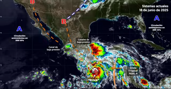 Ciudad de México, 18 de junio de 2025.- Las bandas nubosas del huracán Erick, categoría 1 en la escala Saffir-Simpson, y el arrastre de humedad que genera, en las próximas horas, ocasionarán lluvias extraordinarias (mayores a 250 milímetros [mm]) en Oaxaca, torrenciales (de 150 a 250 mm) en Guerrero y Chiapas, viento de 120 a 140 kilómetros por hora (km/h) con rachas de 150 a 170 km/h en costas de Oaxaca y Guerrero, de 60 a 80 km/h con rachas de 100 a 120 km/h en Chiapas, oleaje de 5 a 6 metros (m) de altura en Oaxaca y Guerrero, de 4 a 5 m de altura en Chiapas y marea de tormenta de 1 a 2 m en la costa de Oaxaca.