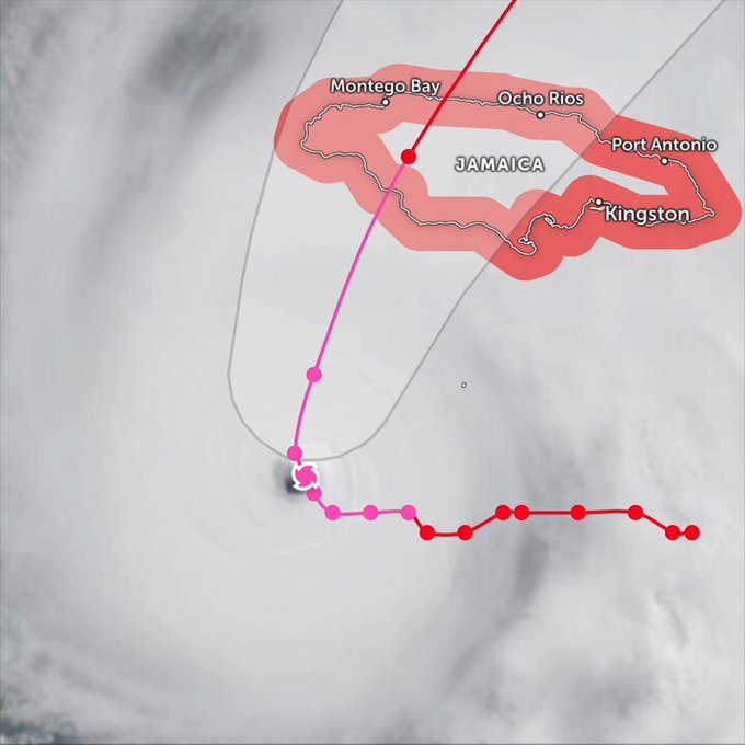 El ojo del huracán, perfectamente simétrico, se encuentra a 50 millas al sur-sureste de Kingston, Jamaica, avanzando lentamente hacia el noroeste a 5 millas por hora.
