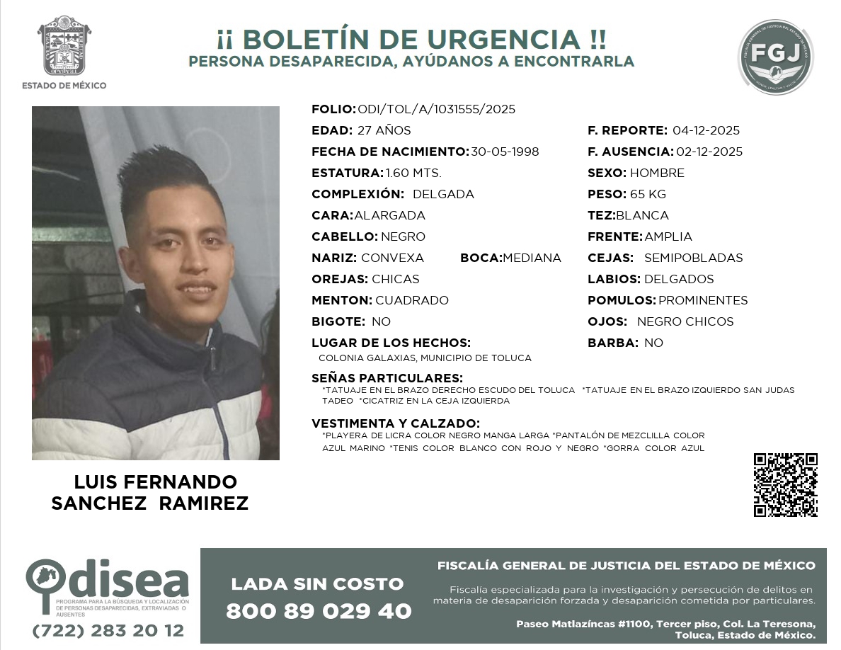 Toluca, Estado de México, 9 de diciembre 2025.- Luis Fernando, de 27 años, había sido reportado como desaparecido el 2 de diciembre en la colonia Galaxias, al norte de Toluca. Durante seis días, autoridades estatales y municipales realizaron labores de búsqueda en la zona, concentrándose en parajes cercanos al último punto donde se le vio.