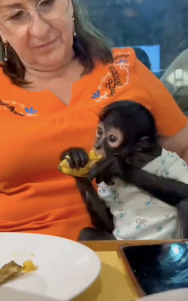 El animal aparece vestido con un suéter, con arnés y correa. En las grabaciones se aprecia que el primate muestra signos de inquietud mientras es sostenido por la regidora, quien realiza movimientos para intentar controlarlo.