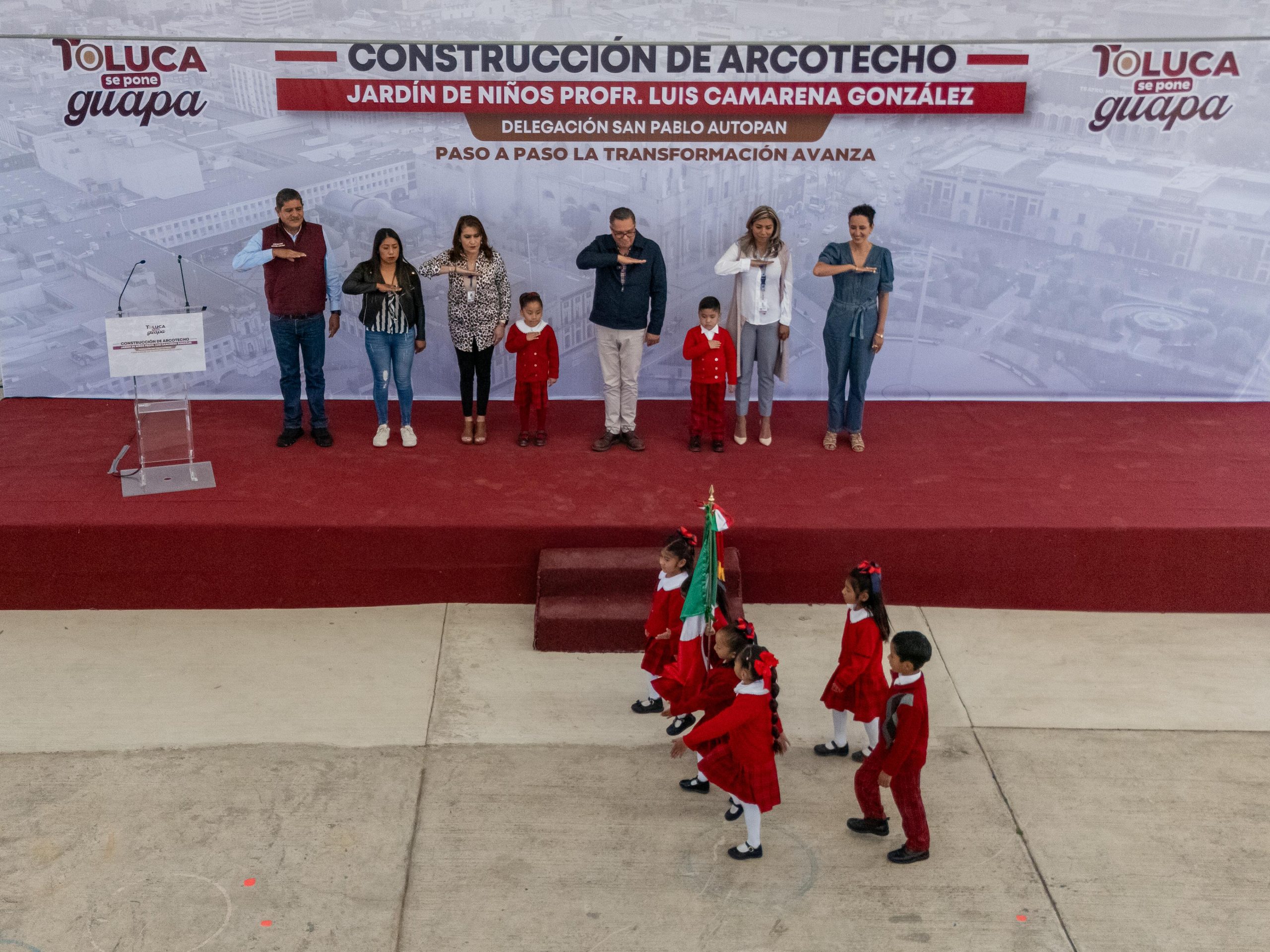 Con la entrega del arcotecho, el gobierno municipal informó que se atiende una petición reiterada de la comunidad escolar de San Pablo Autopan y se fortalece la infraestructura educativa en esta delegación de Toluca.