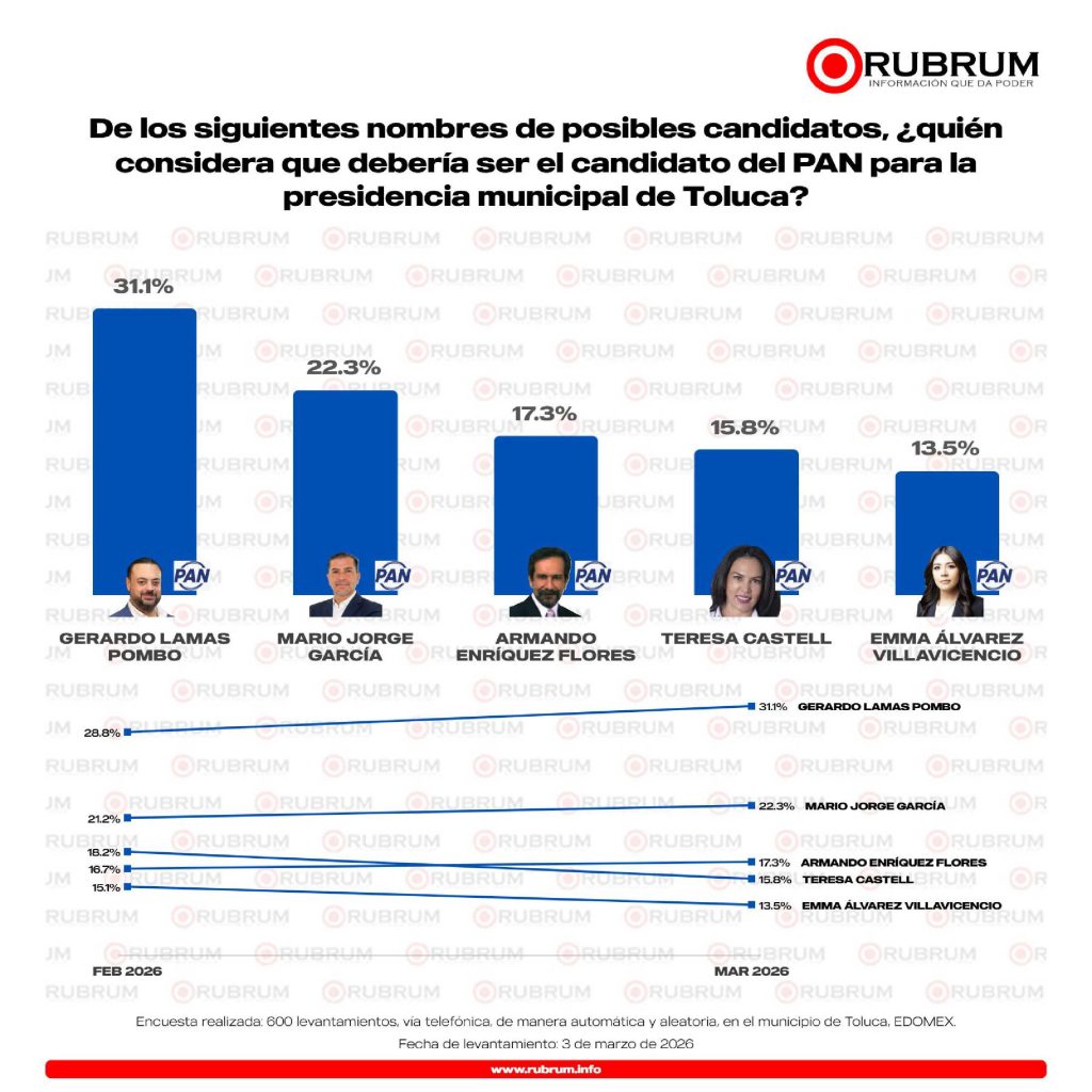 En cuanto a los posibles candidatos del Partido Acción Nacional, la encuesta posiciona en primer lugar a Gerardo Lamas Pombo, quien obtiene 31.1% de las preferencias entre los nombres evaluados.