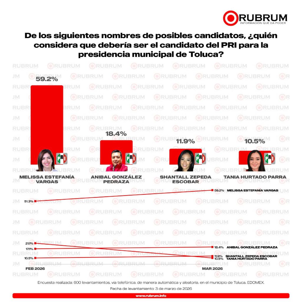 En el caso del PRI, la encuesta muestra una ventaja considerable para Melissa Estefanía Vargas, quien alcanza 59.2% de las preferencias entre los perfiles evaluados.
