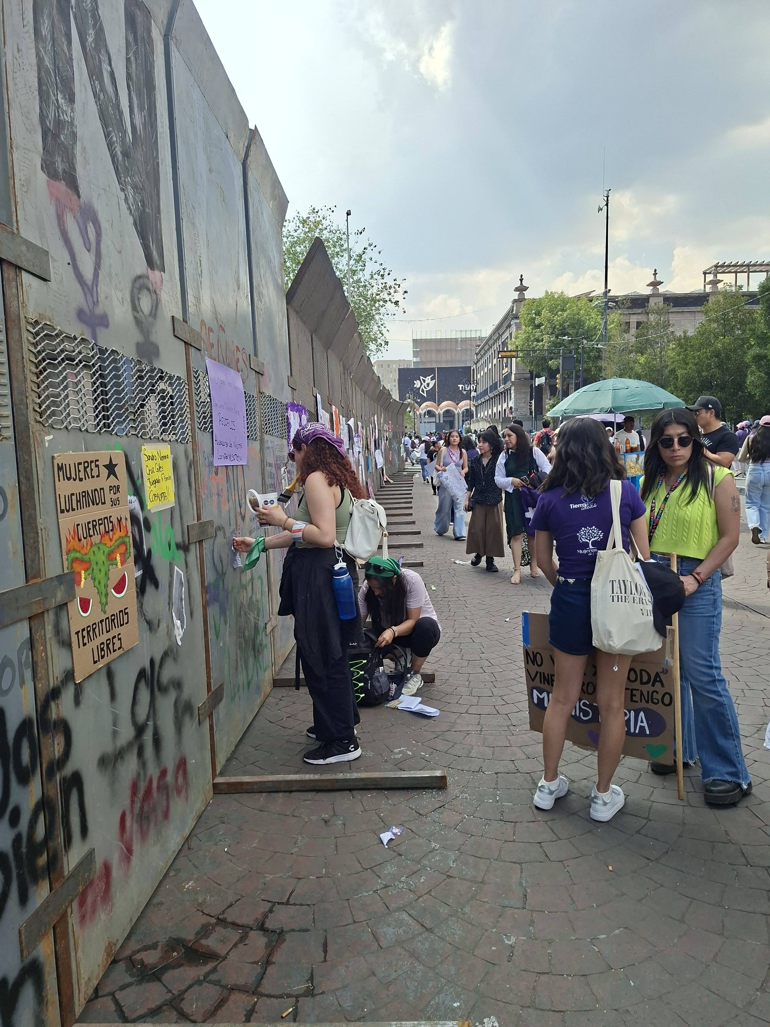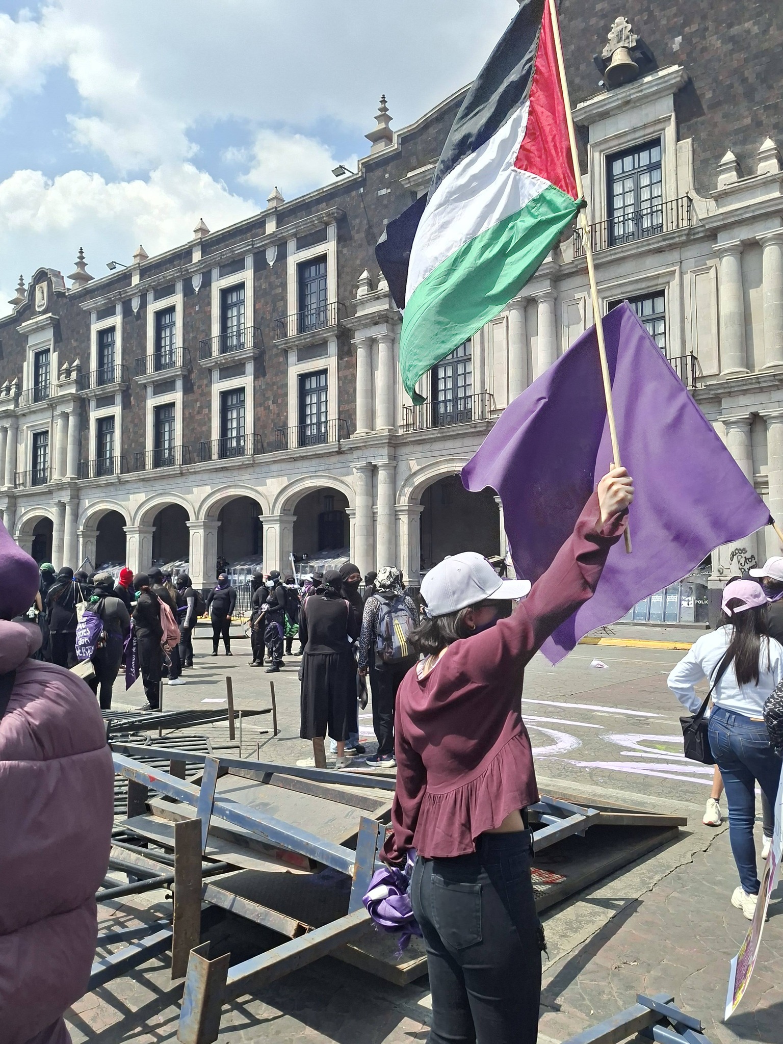 La movilización también registró momentos de tensión. Algunas manifestantes realizaron pintas en el Palacio de Gobierno y derribaron vallas metálicas colocadas para resguardar edificios públicos y monumentos.