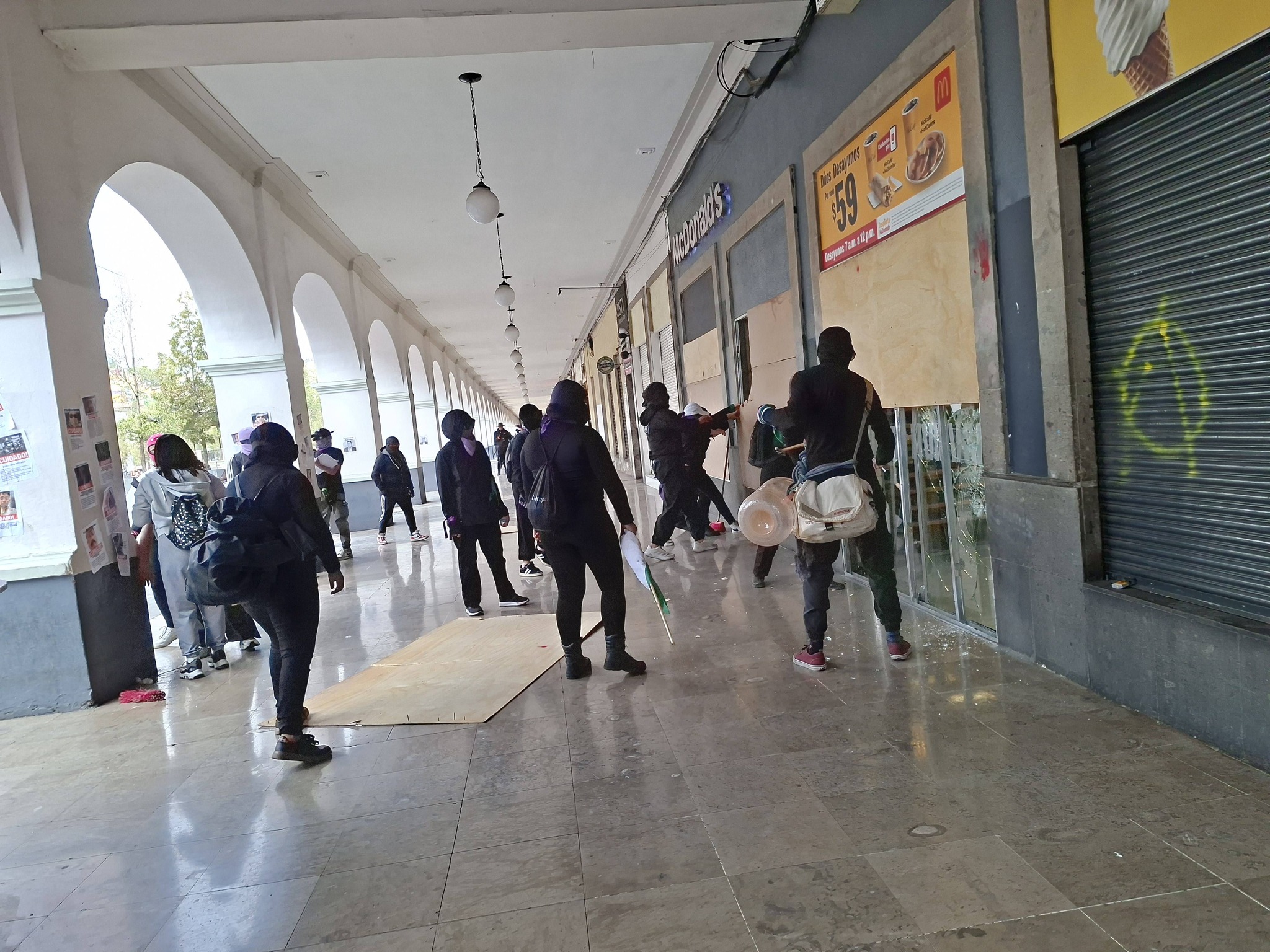 Uno de los incidentes ocurrió en los Portales del centro histórico, donde un restaurante McDonald’s presentó vidrios rotos durante la movilización.