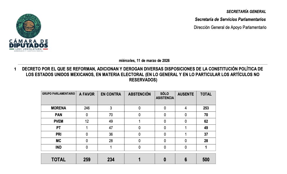 La iniciativa constitucional no logró reunir la mayoría calificada necesaria para su aprobación. Tras el resultado, el gobierno planteó avanzar mediante cambios a leyes secundarias, una vía que permite modificar ciertos aspectos del sistema sin necesidad de reformar la Constitución.